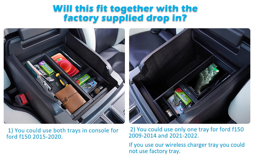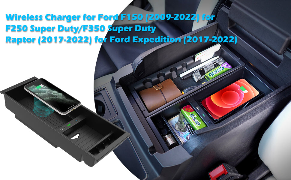 - PATENT Design: designed by CarQiWireless for Ford F150 F250 F350, with storage and wireless charging function.Suitable for Ford F150 XL/XLT/LARIAT/KING RANCH/PLATINUM/LIMITED/RAPTOR/F150 (2009-2025) | F250 /F350/ F250 Super Duty/F350 Super Duty/Raptor (2017-2022) | Expedition (2018-2021). Different from the center console cover for Ford F-150, it is super easy to use
