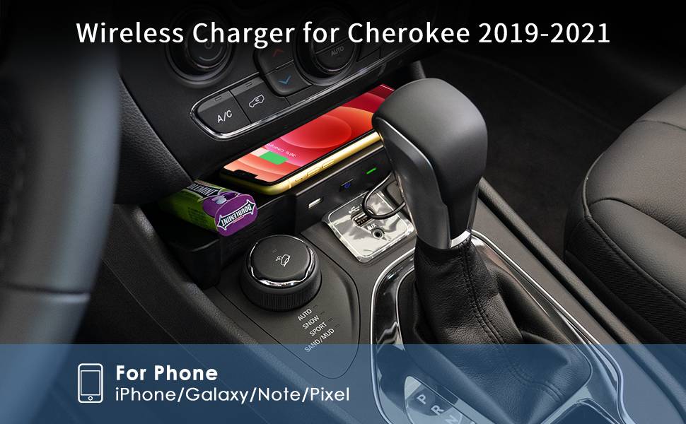 - Patent Design, Don't fit for Grand Cherokee, exact fit to Your Factory Center Console. This wireless charger is the customized design for Jeep Cherokee 2019-2021