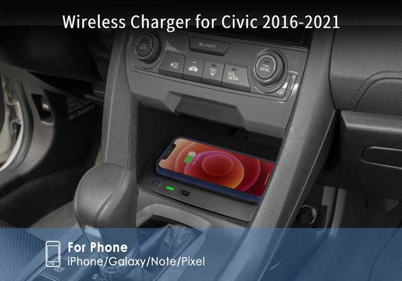 - The CarQiWireless wireless charger for Civic is the newest customized design for 10th gen Civic Vehicles 2016 2017 2018 2019 2020 2021which don't have the original wireless charging function, you can take advantage of the wireless charging function in your car with it, it is a must-have accessory to upgrade your car interior. Fit for Civic Sedan/Civic Si Sedan/Civic Coupe/Civic Si Coupe/Civic Hatchback/Civic Type R etc perfectly.